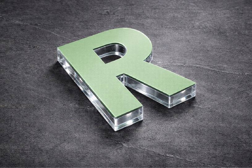 アクリルをベースに使用し、表面にカラーPVC シートを貼り込むことで仕上げたアクリル切り文字の施工事例です。アクリルならではの透明感と シャープなエッジを活かしながら、シートによって自由なカラー表現が可能となります。企業ロゴやブランドカラーの再現性が高く、オフィスサインや 店舗内装サインなど幅広い用途に適した立体文字です。